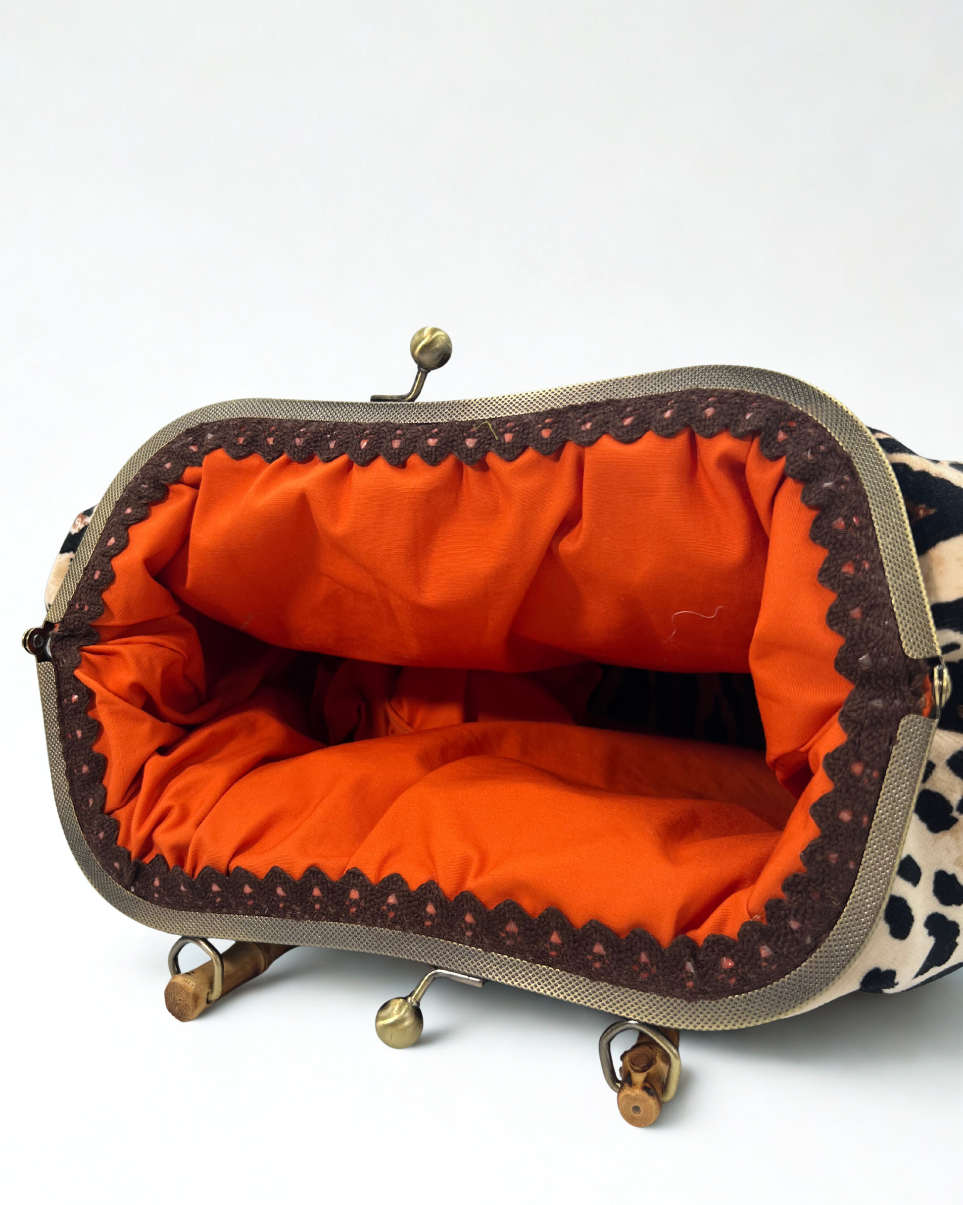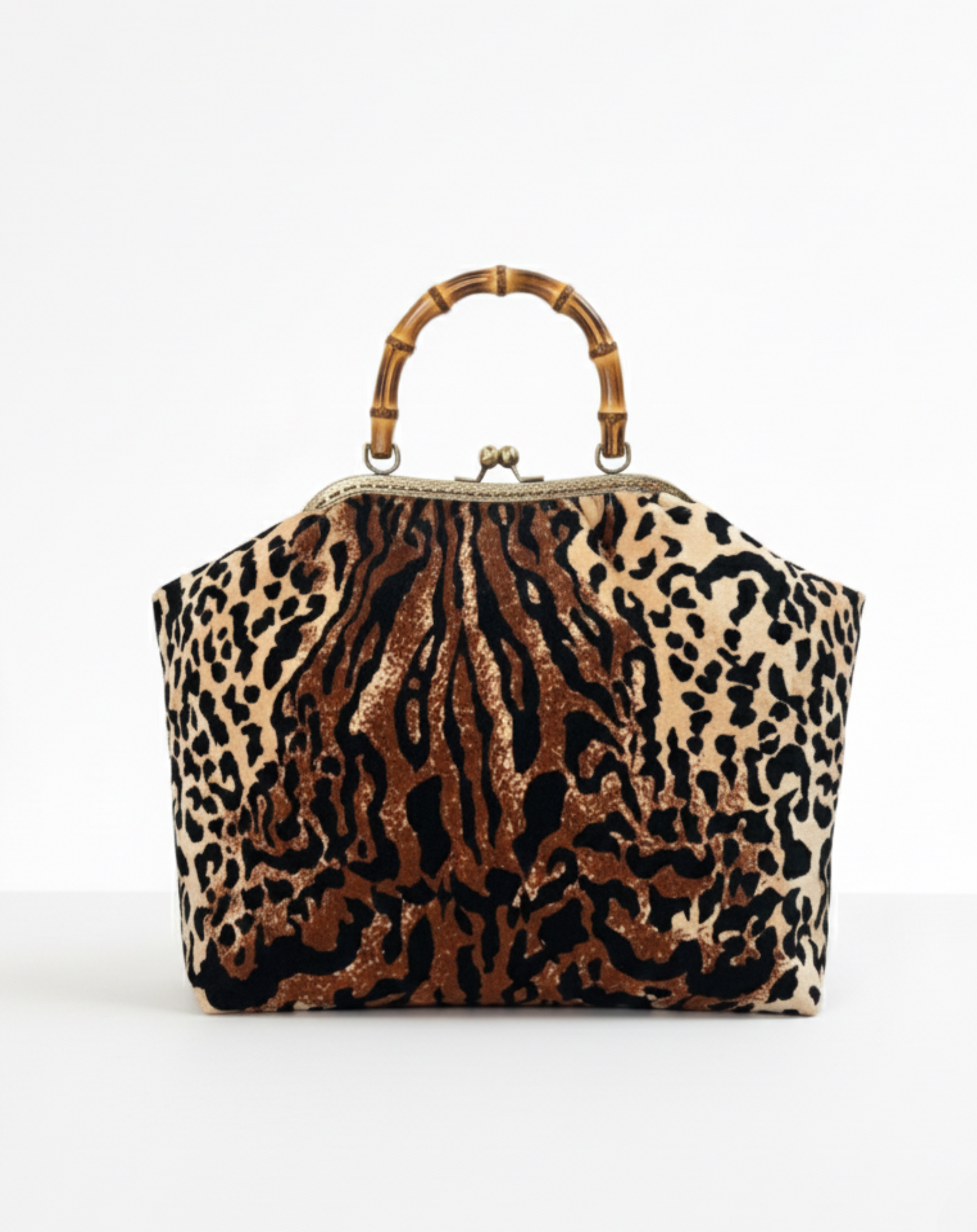 Realizzata in un velluto leopardato morbido e luminoso, abbina il carattere deciso della fantasia al fascino naturale del suo manico: una struttura in metallo oro satinato impreziosita da un elegante inserto in bambù, che rende ogni pezzo unico.