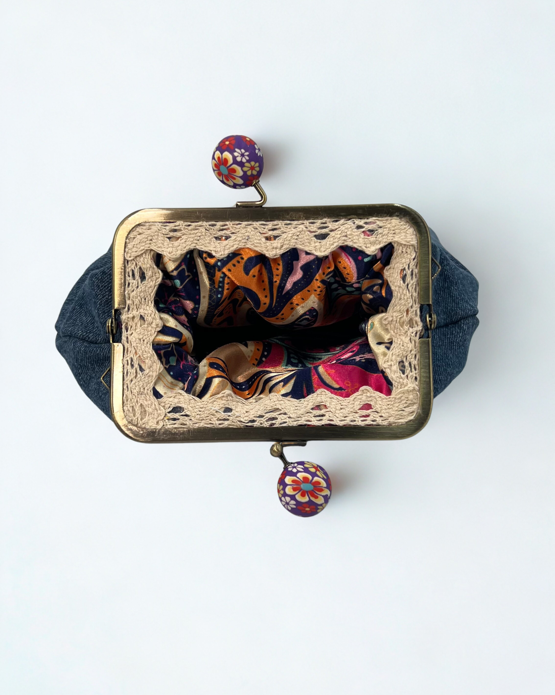 Realizzate con tessuti di recupero selezionati, ogni mini bag unisce qualità e sostenibilità. Esterno in tessuti pregiati o velluto, interno foderato in cotone o raso. I manici, in legno, bambù o metallo, completano un accessorio unico e artigianale.