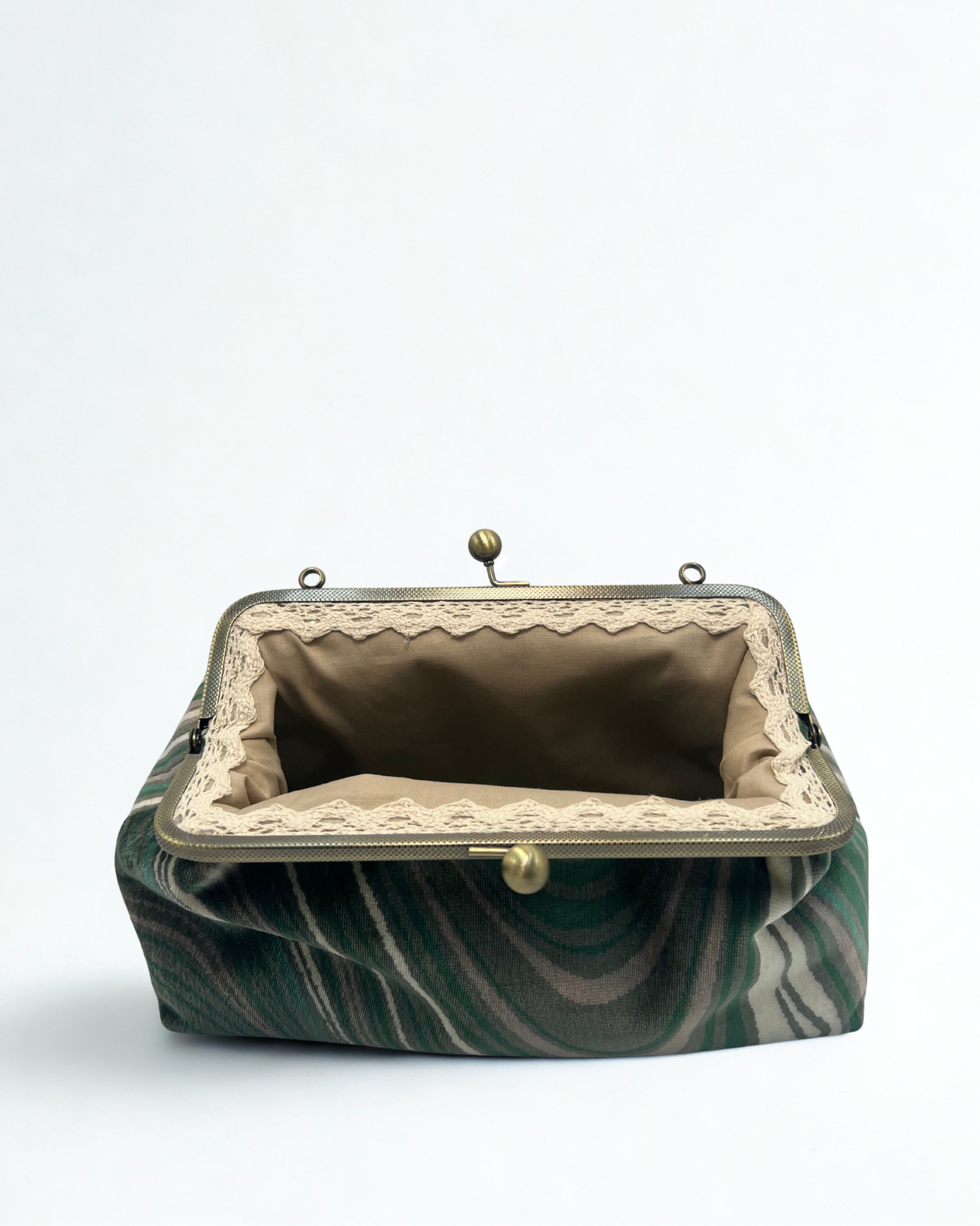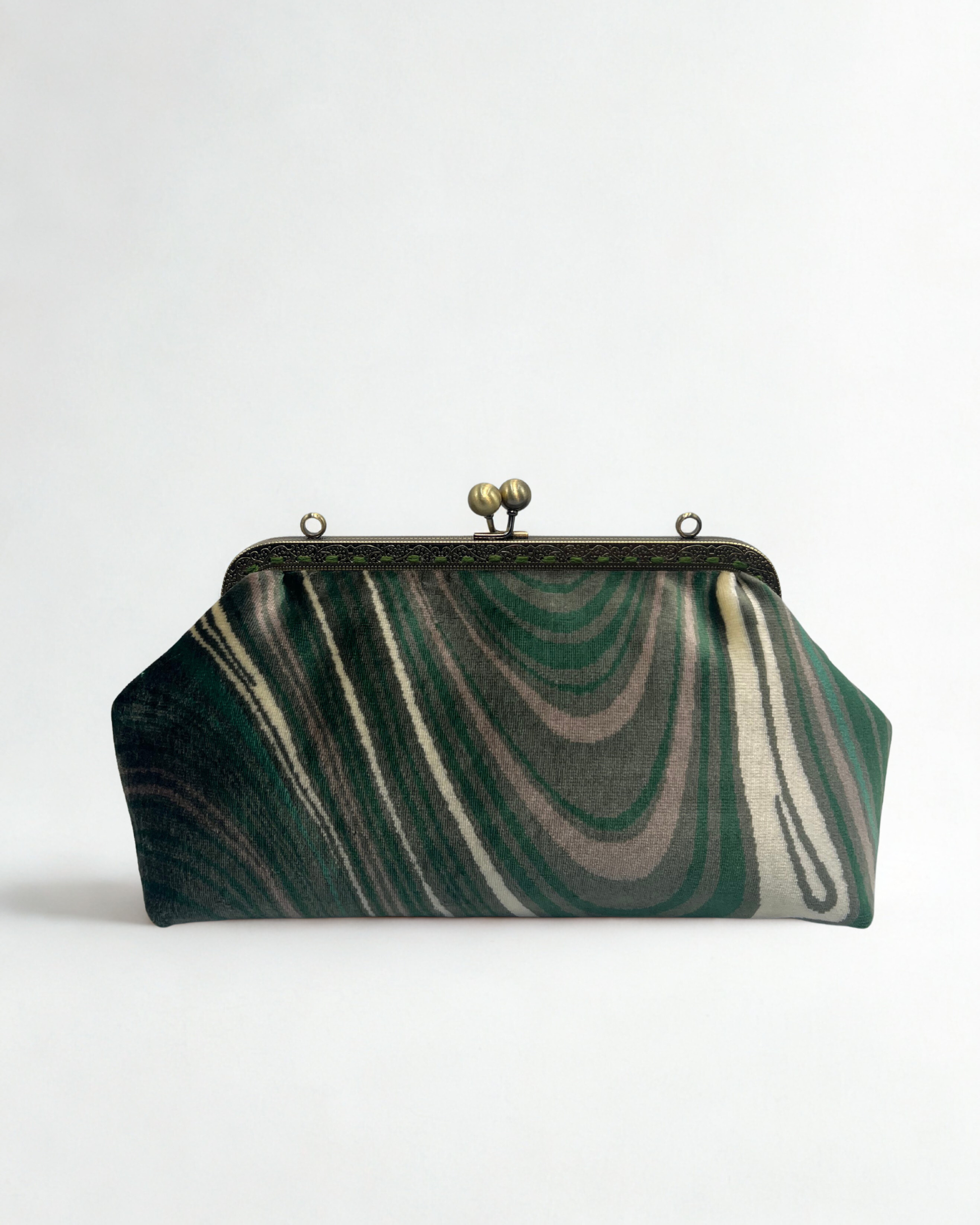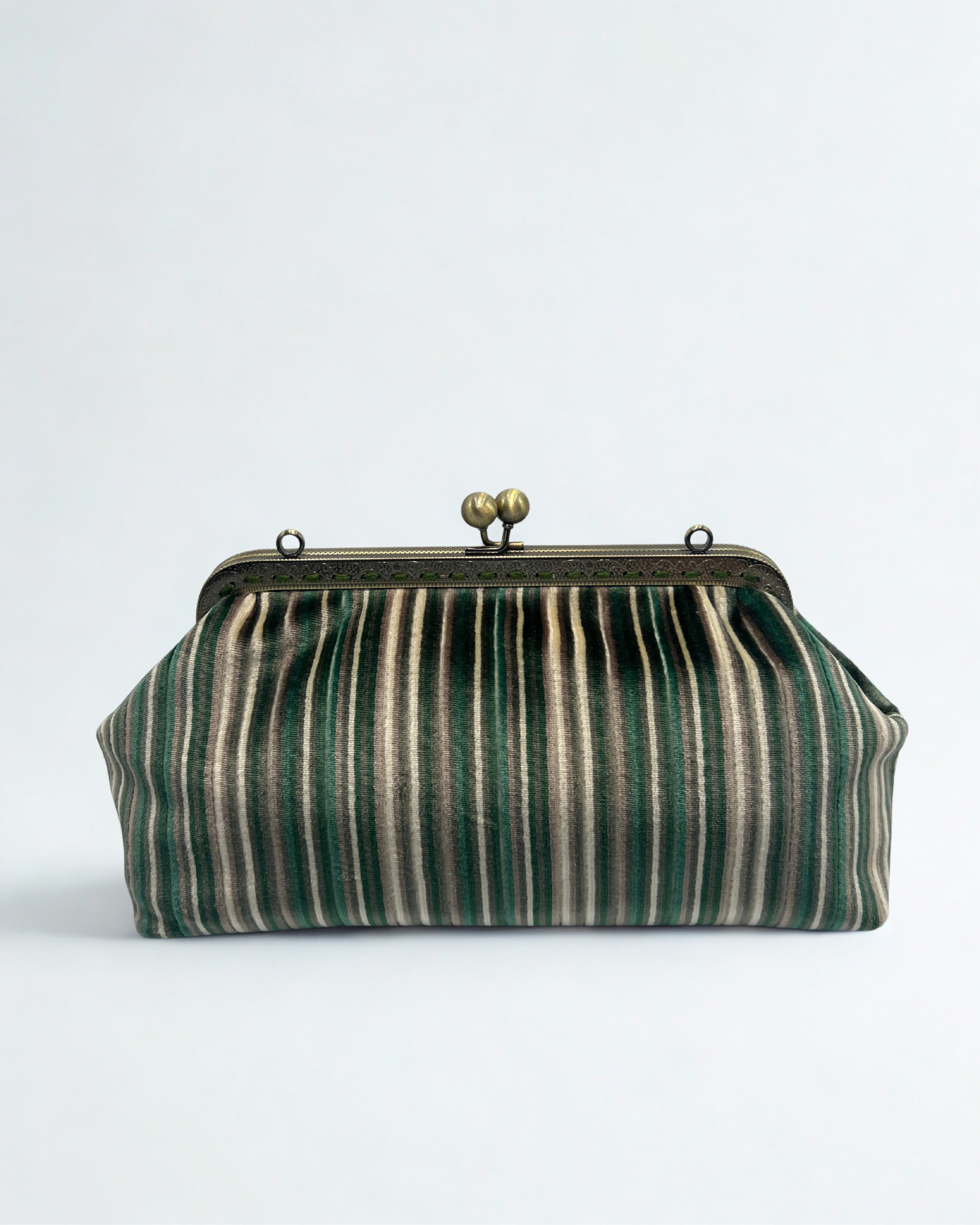 Realizzate con tessuti di recupero selezionati, ogni mini bag unisce qualità e sostenibilità. Esterno in tessuti pregiati o velluto, interno foderato in cotone o raso. I manici, in legno, bambù o metallo, completano un accessorio unico e artigianale.