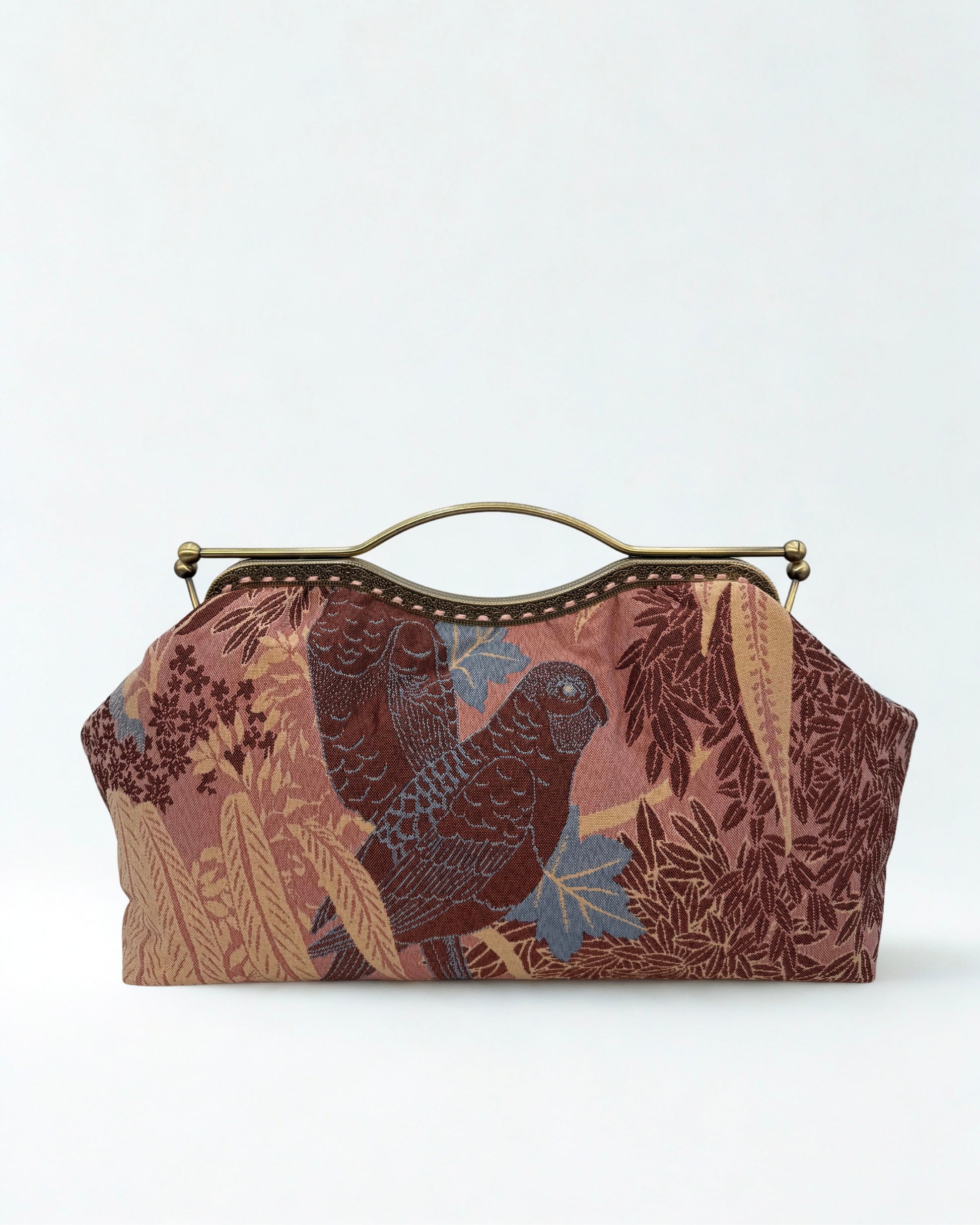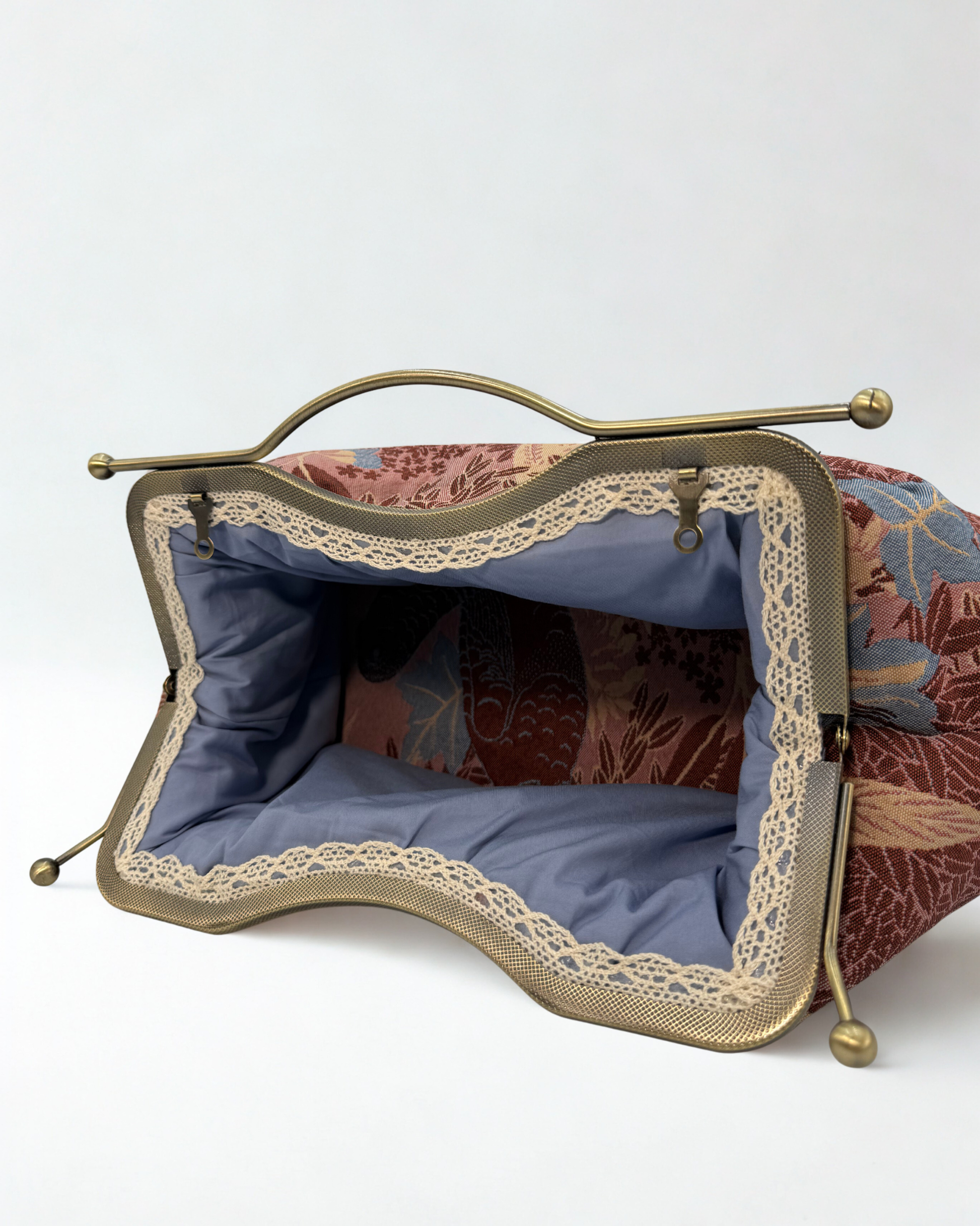 I manici, elemento distintivo del modello, possono essere in legno, metallo oppure una combinazione dei due, scelti in base all’abbinamento con il tessuto e al carattere della borsa.