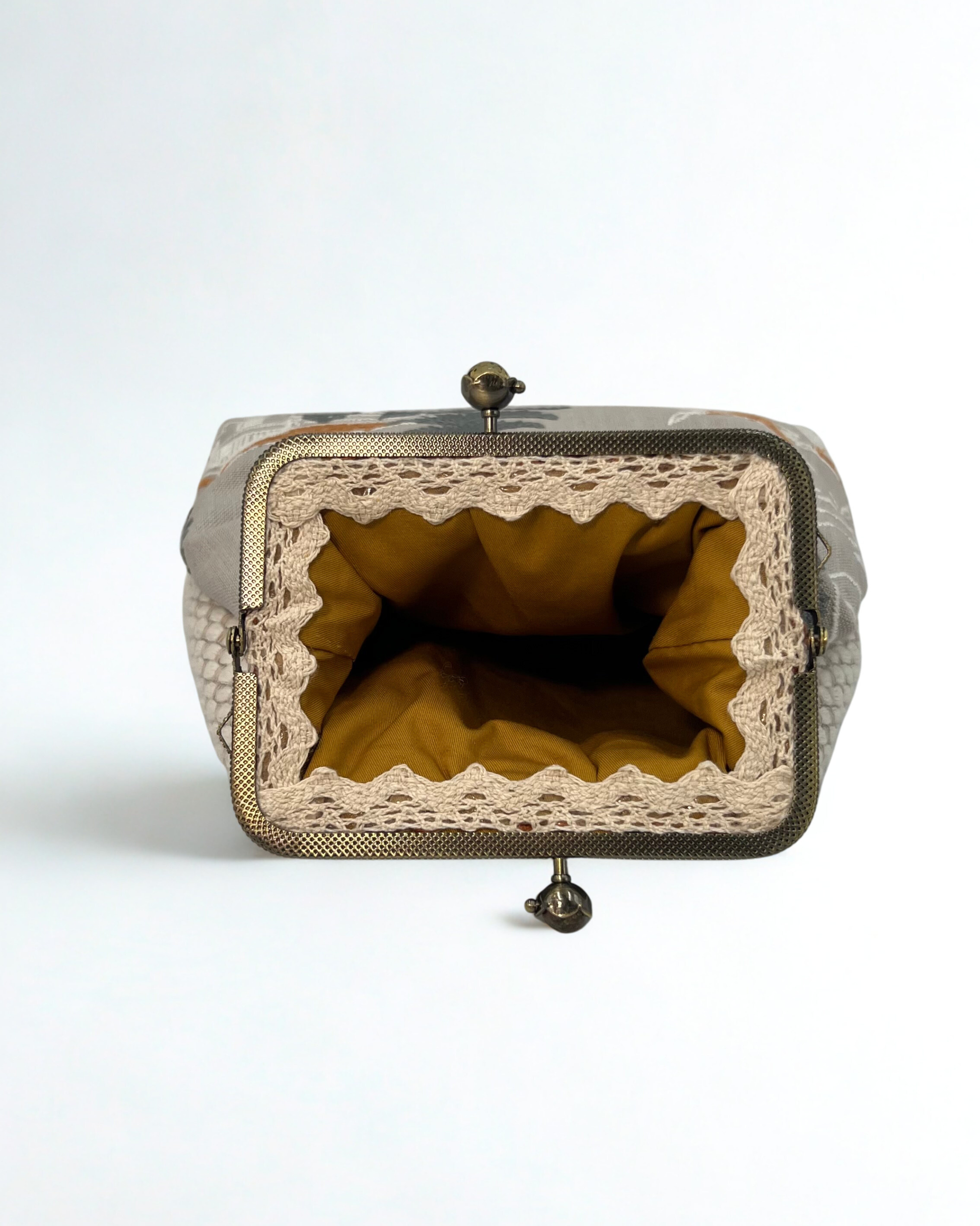 Realizzate con tessuti di recupero selezionati, ogni mini bag unisce qualità e sostenibilità. Esterno in tessuti pregiati o velluto, interno foderato in cotone o raso. I manici, in legno, bambù o metallo, completano un accessorio unico e artigianale.