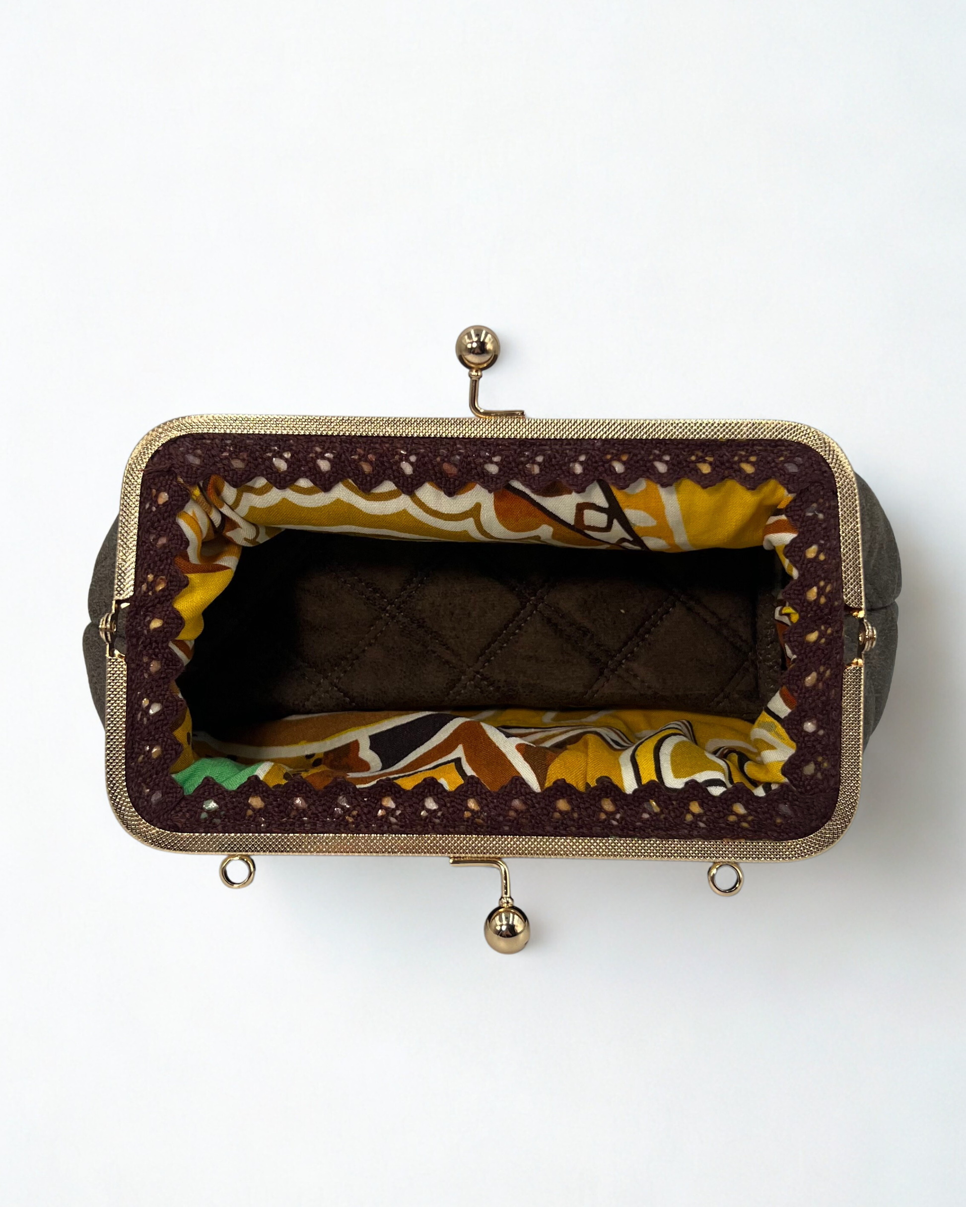 Realizzate con tessuti di recupero selezionati, ogni mini bag unisce qualità e sostenibilità. Esterno in tessuti pregiati o velluto, interno foderato in cotone o raso. I manici, in legno, bambù o metallo, completano un accessorio unico e artigianale.
