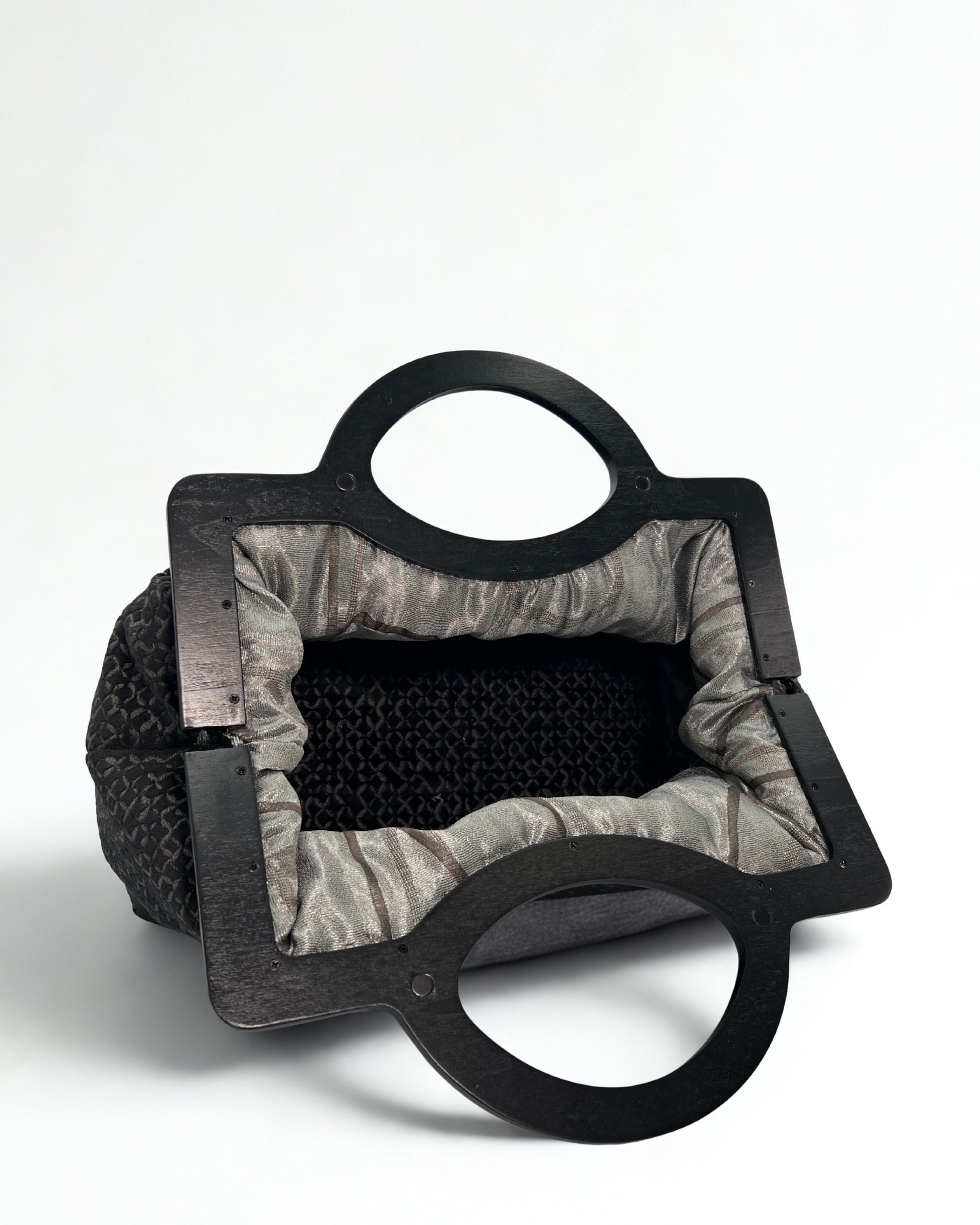 L'interno di ogni borsa è rifinito con tessuti resistenti e morbidi al tatto, come misti lino-raso o fodere compatte in tinta unita. La scelta dei colori richiama sempre i dettagli del tessuto esterno, creando armonia e continuità visiva.